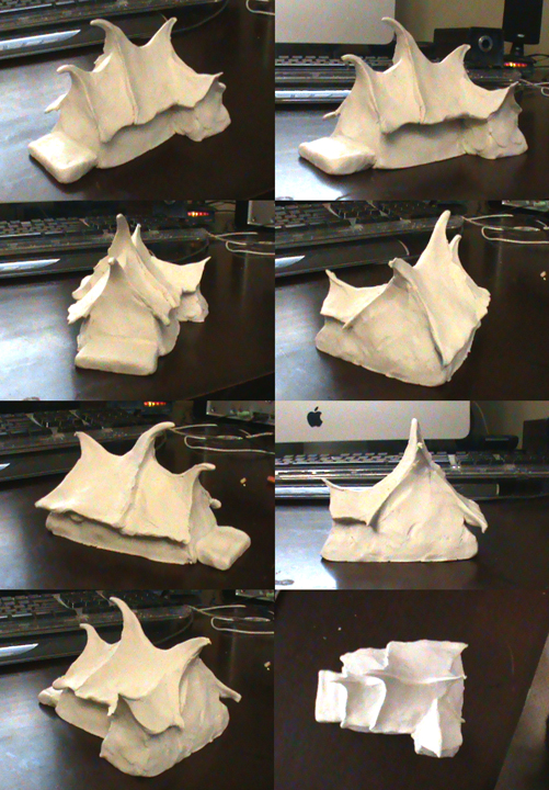 Here is a final elevation and a rough 3/4 view of the cottage. I did a really rough model of the cottage in Sculpy. It's 6" long x 4" wide and 3 1/2 " high.