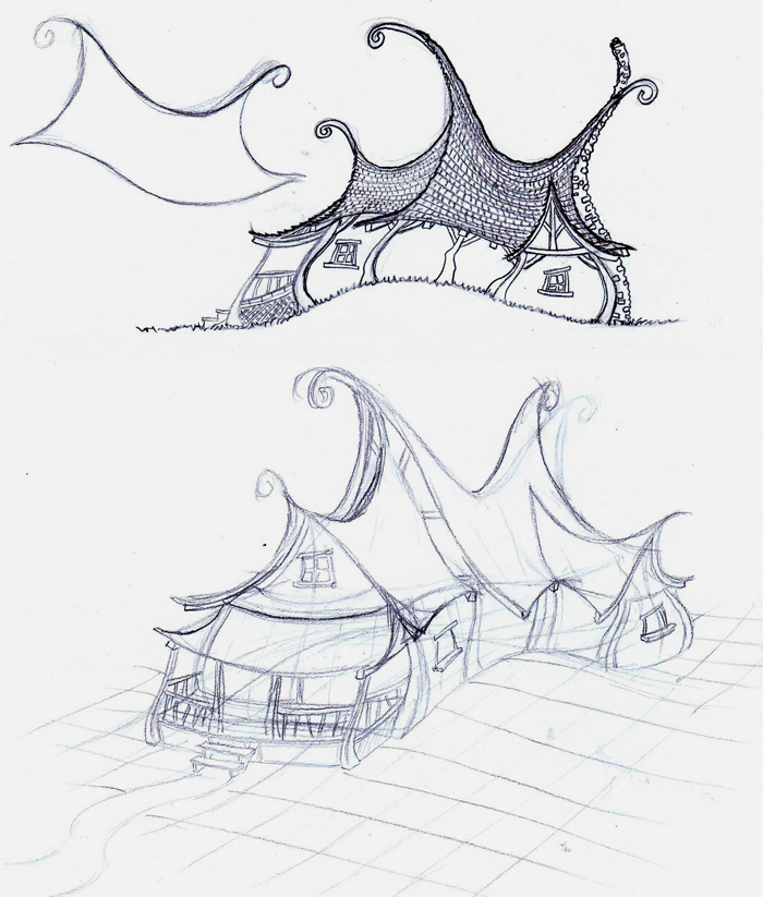 Here's a sketch of the outside of the cottage before and after the Witch added candy to it.