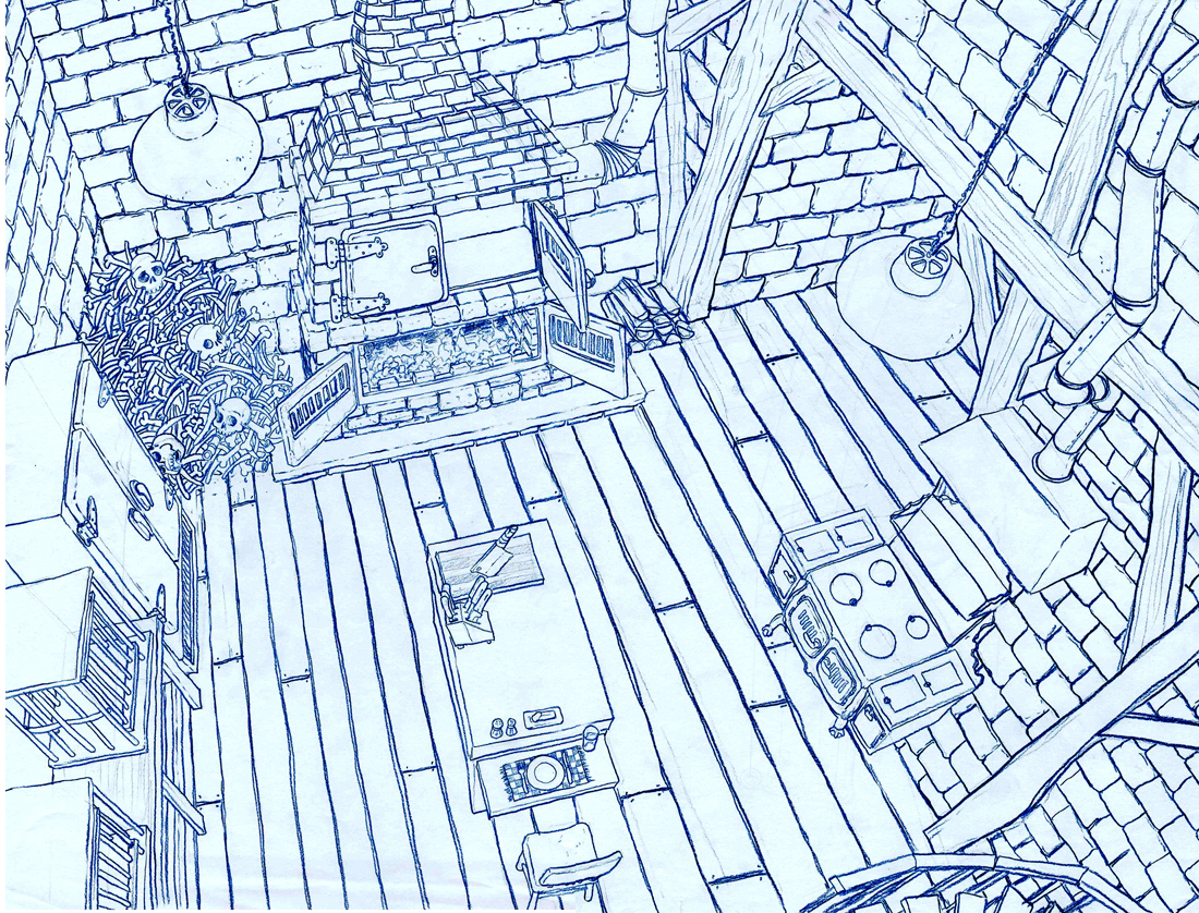 Here's my opposing view of the kitchen, looking towards the stairs. This is just the initial sketch I did to block out the perspective and placement of stuff.