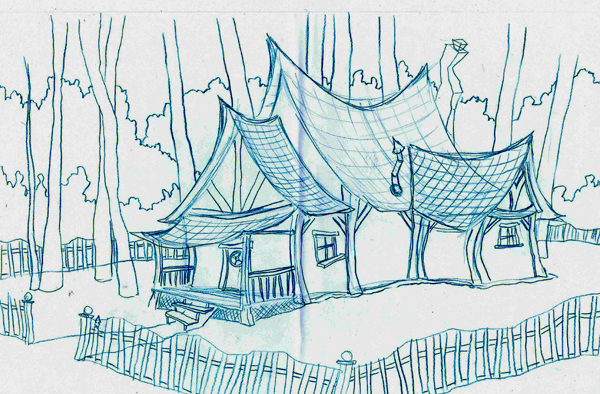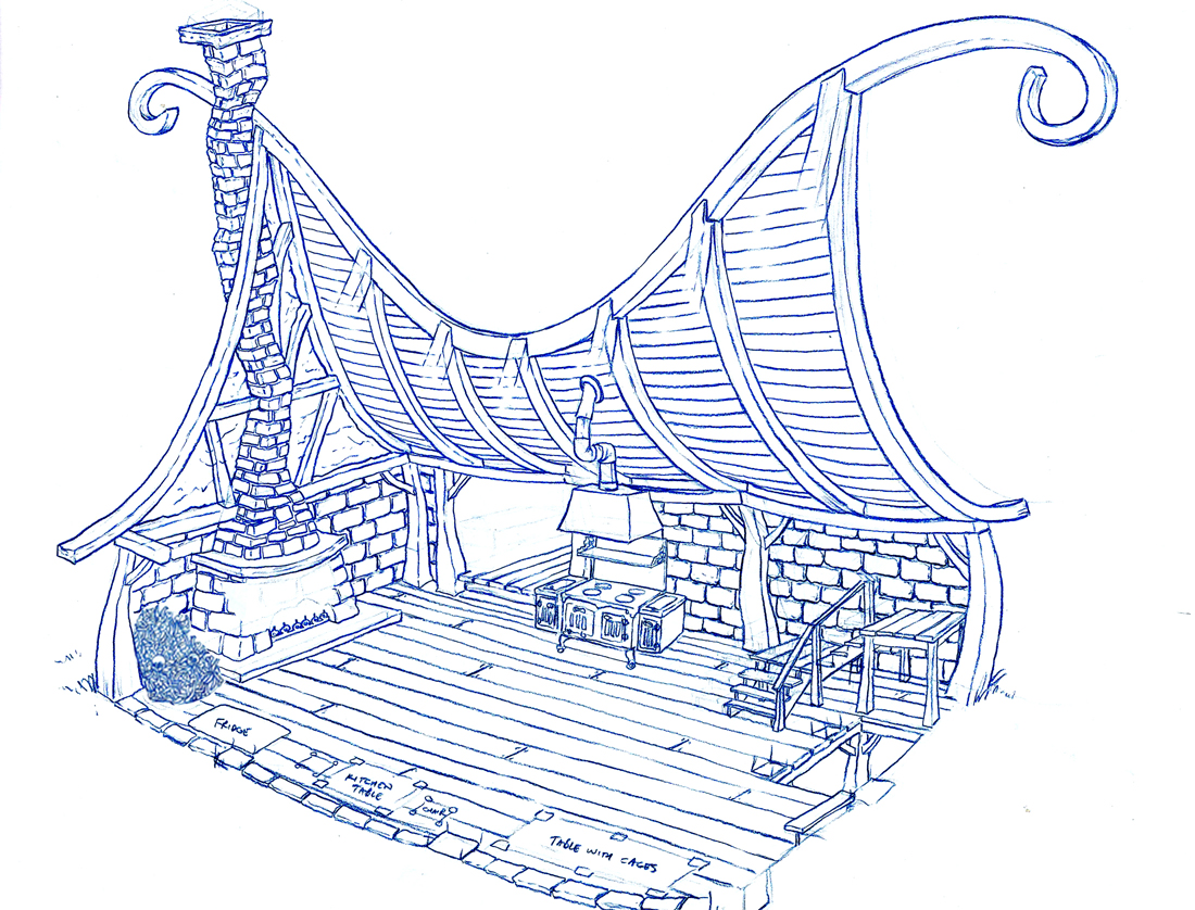 Here's a sketch of the outside of the cottage before and after the Witch added candy to it.