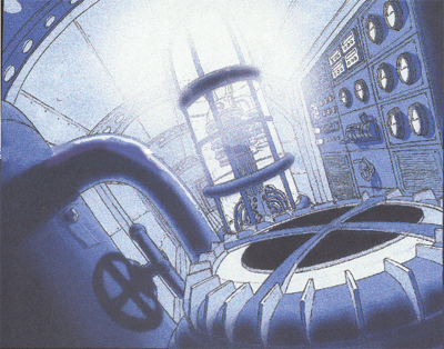 The rendering was done in markers using blue, medium blue and dark blue, working wet-on-wet as well as wet-on-dry. The final stage was the glow effect which I did in PhotoShop using the airbrush tool. The glow effect would actually be an animated effect in the final production. By doing the effect in PhotoShop I was able to keep the original rendering in tact for later reference. |